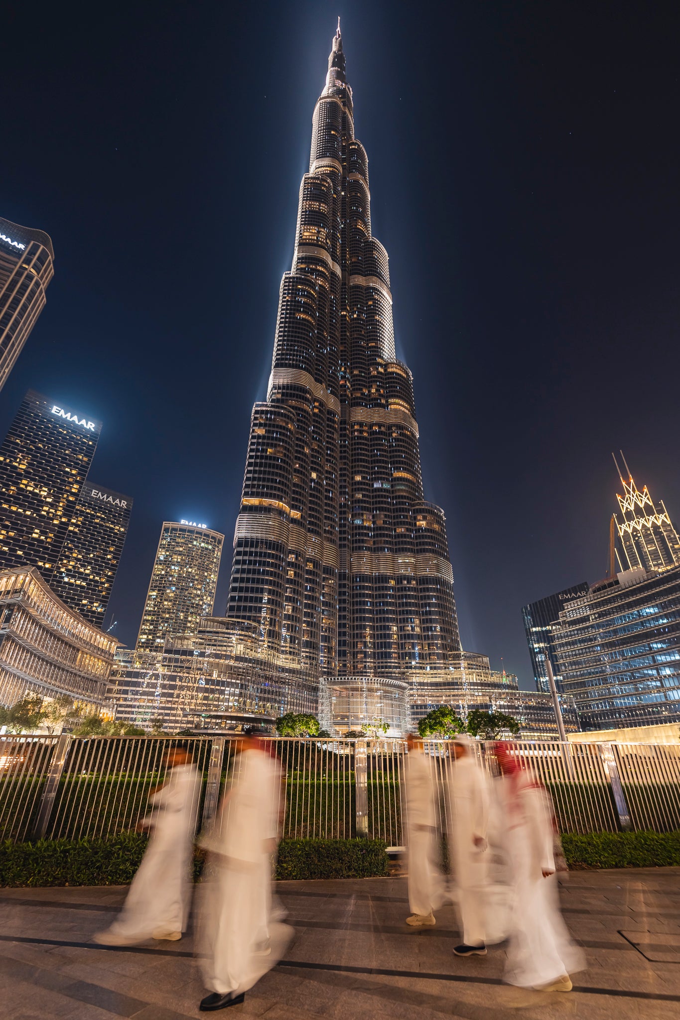 It was a business trip to Dubai, I was having my meetings all day long and I had only found an opportunity to go for photography in the late evenings when the moon was on. Especially in Dubai street lights and sky scrappers, life style during night very interesting. Plenty of buildings when you head up and see there is limited view to see the sky. The moment of this photograph was also epic for me because I went to Dubai Mall for a dinner and after watching the water presentation, I was walking back to street level, on my way I stopped here and waited to combine Burj Khalifa with locals. It was so quick a group of locals passed by and thankfully I have saved it. After taking this photograph I have waited 30 mins to take some variations of the same photograph however it didn't happen. Locals wasn't there again.