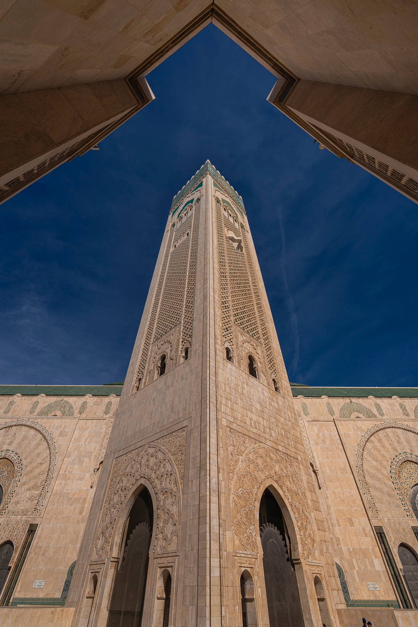 Scenic view of Minaret and walls of Hasan II Mosque. It was the first day after arriving to Casablanca, before seeing the old town me and my close friend (Mustafa Otyakmaz he is also a photographer) we decided to go Cornish of the Atlantic Ocean. Impressive huge building was clashing the waves. we bought two tickets to see whole building however it was pray time and we were very tight of time therefore we could only take photographs from the courtyard of the Mosque.