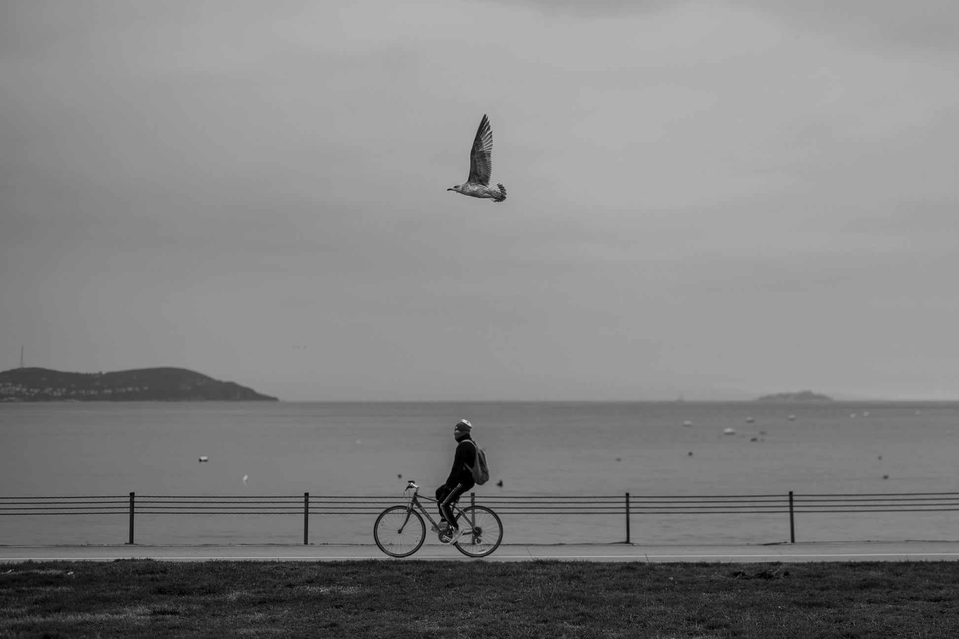 This photograph has some good vibes, likewise at the day I have captured this photo, I was so bored and I went out walking by the coast of Fenerbahce with nonsense. At these kind of walkings I always take my camera with me. I had a look at the seagulls flying over, randomly I have seen the biker left the steering bar and at the same time seagull was targeting his move. Seagull was flying towards him but I didn't expected that it would fly just over him. I got ready and started shooting and that moment came to real. It flew over him.