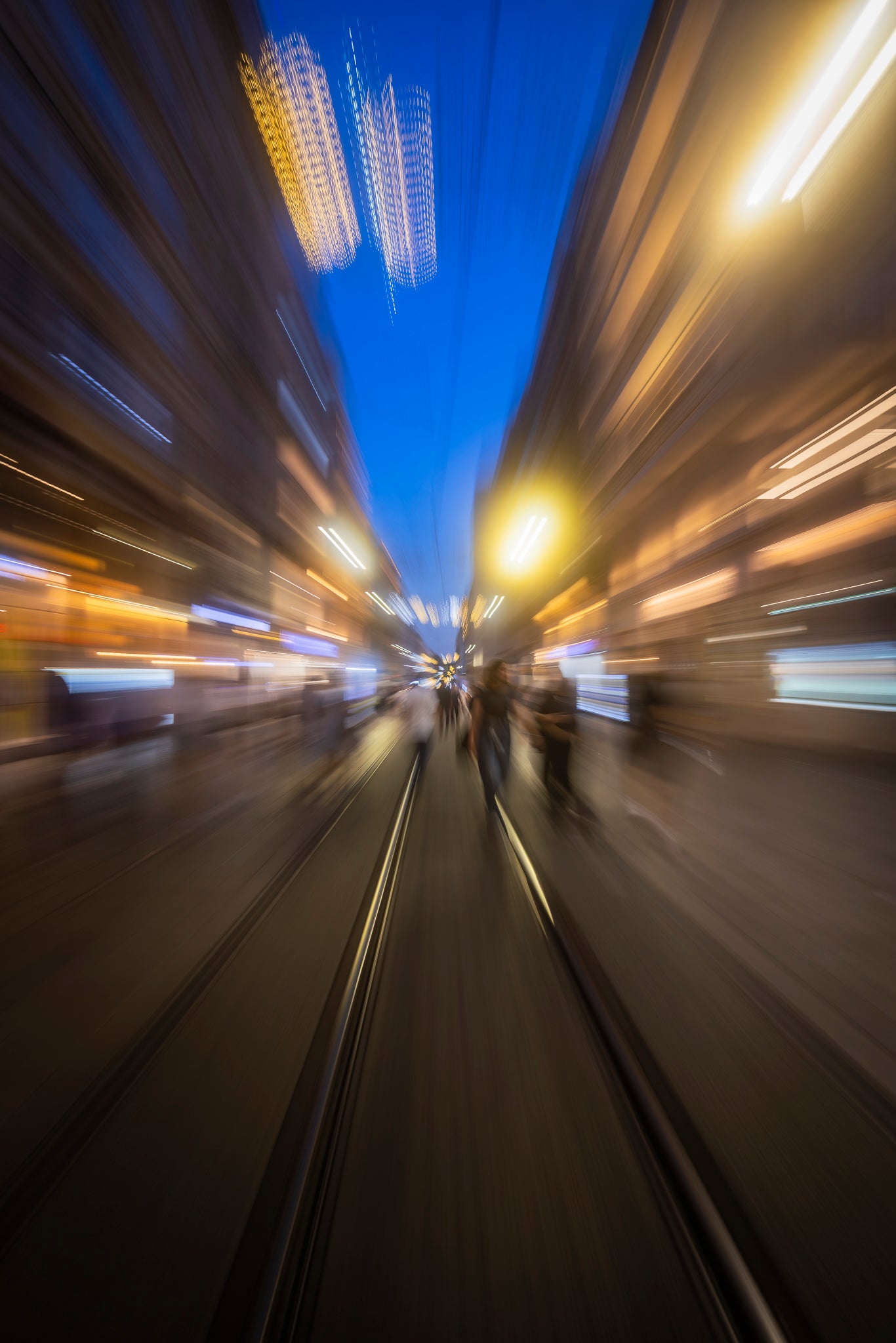 Zooming light manipulation on the rail route of Istiklal St. historic tramway.